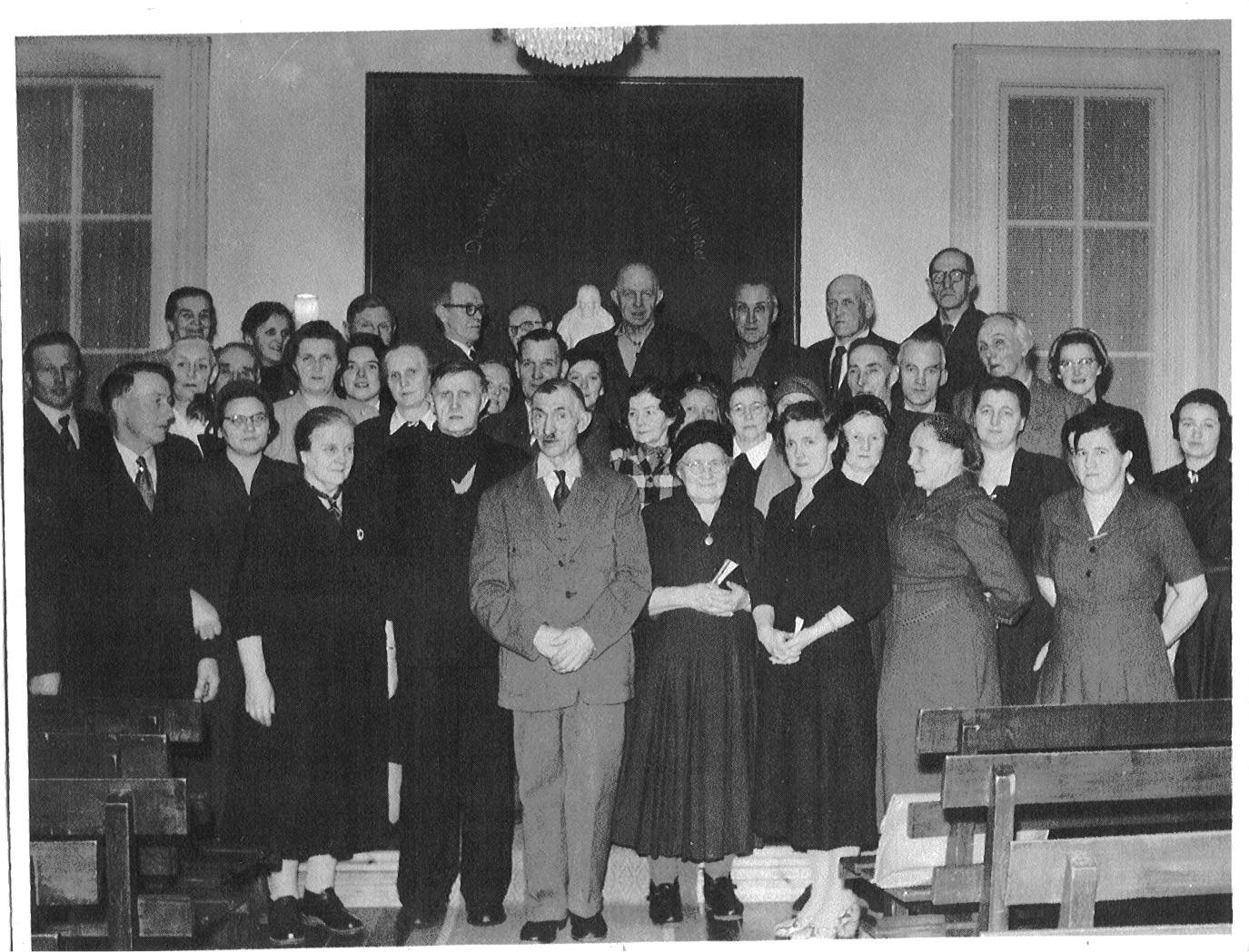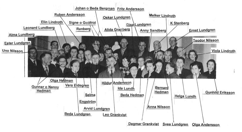 Bilden tagen i EFS-kapellet i Vidsel troligen sent 50-tal..Bilden har min mamma Gudrun Lundgren i Vidsel fått av Britta Bergvall i Piteå. Gudrun L. har namngett personerna och namn med tillhörande ansikte är markerat på bild nr 2. Nåt fel kan nog finnas.