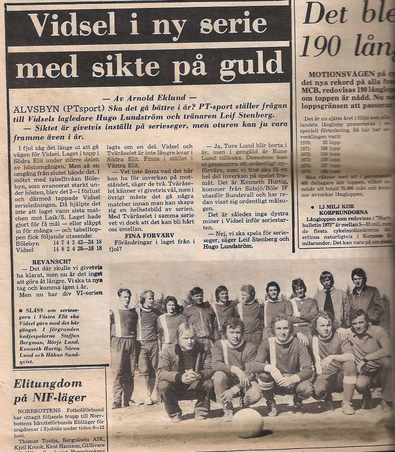 Hittade detta gamla klipp vid städning. Hittade också Vidsels hemsida och denna mejladress. Kolla in vilket jävla kanongäng, outstanding. Måste varit runt 1975-76 nånting. Undertecknad är 3a från vänster i nedre raden bredvid Vidsels fotbollslegendarer och stjärnor Staffan Bergman och Börje Lund. Röda tröjor med vitt streck var färgerna. Kommer ihåg att Älvsbyn då ville att jag skulle skriva på för dom men mitt jobb på "vädret på RFN" gjorde att jag inte kunde. Detta var ett kanongäng så jag grämde mig aldrig över den missade div3 chansen.