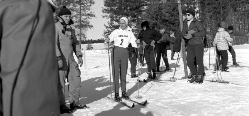 Skidåkare 1963. Enligt uppgift är det Eva Lundgren som står på startlinjen.