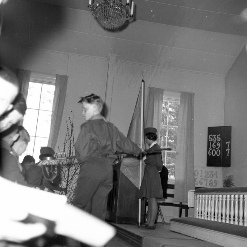 Scoutinvigning 1962. Enligt uppgift från Monica Strömgren (f. Ocklind) så är det hon som står uppe vid orgeln och håller fanan.