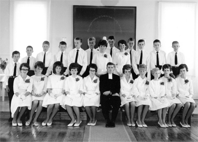 Konfirmationsgrupp 1963 i EFS-kapellet. Årtalet korrigerat via upplysning från Marianne Karlsson (själv med på bilden!)