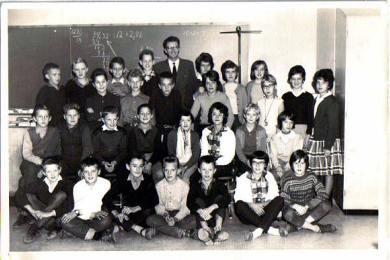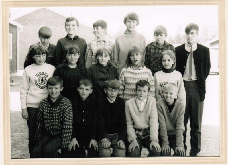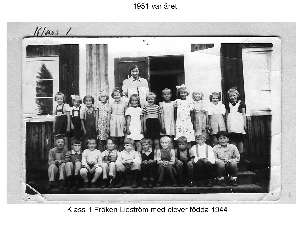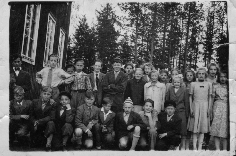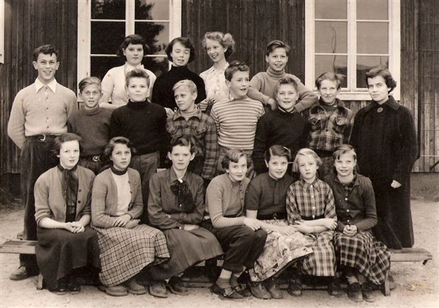 Längst bak fr.v.: Viveka Karlsson, Göte Eriksson, Ola Karlsson, Anders Jonsson, Mats Westerlund, Börje Westerlund, Rudolf Lundberg, Anita Eriksson, lärare Arvid Höglund.