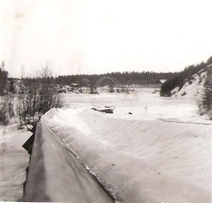 Detta är timmerrännan i Pansikån medan den var hel. Bilden är tagen med en vanlig enkel lådkamera. Året bör vara omkring 1950.